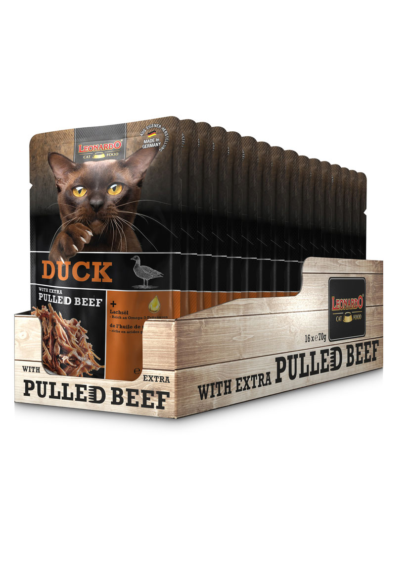 Duck meat, heart, liver, gizzard (34.5 %); Meat broth (34.3 %); Pulled beef (14 %); Chicken liver (8.5 %); Beef lung (7.5 %); Egg shells, dried (0.5 %); Minerals (0.5 %); Salmon oil (0.2 %)